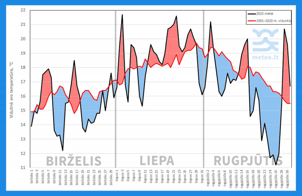 Grafike – 2025 m. vasaros (juoda kreivė) ir 1991–2020 m. (raudona kreivė) laikotarpio vidutinė oro temperatūra Lietuvoje. Raudona spalva rodo šiltesnius, o mėlyna – šaltesnius už daugiametį vidurkį laikotarpius.